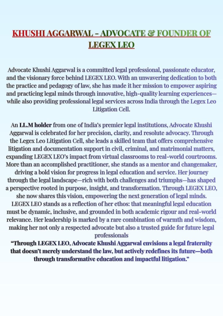 Founded by Advocate Khushi Aggarwal, LEGEX LEO is a cutting-edge digital platform committed to reimagine legal learning for the 21st century. Meticulously crafted for law professionals, law students, judiciary aspirants, and aspiring legal minds alike, LEGEX LEO offers immersive law certificate courses, Notes for law students, Litigation services, Admissions in Law schools, thoughtfully curated webinars, Daily Legal Updates, Vacancy Alerts, Legal News, and ongoing career support to help you stay ahead and transcend traditional academic boundaries.